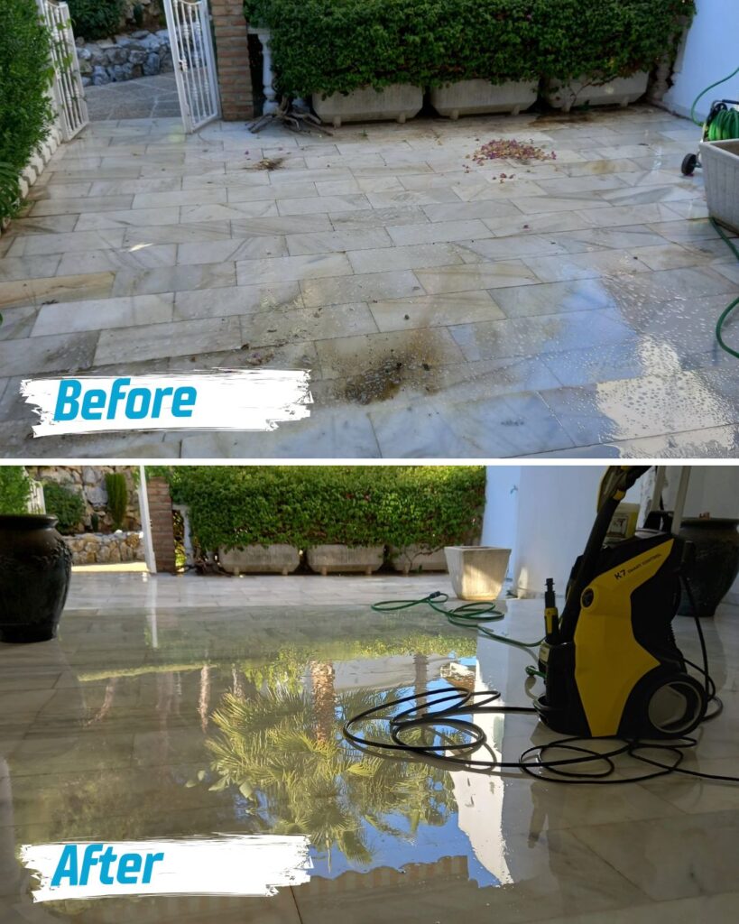 - Pressure Washing Patios Remove stubborn dirt, algae, and years of buildup from concrete, stone, and tile surfaces. Professional high-pressure cleaning restores original color and texture while improving safety by eliminating slippery growth and grime.